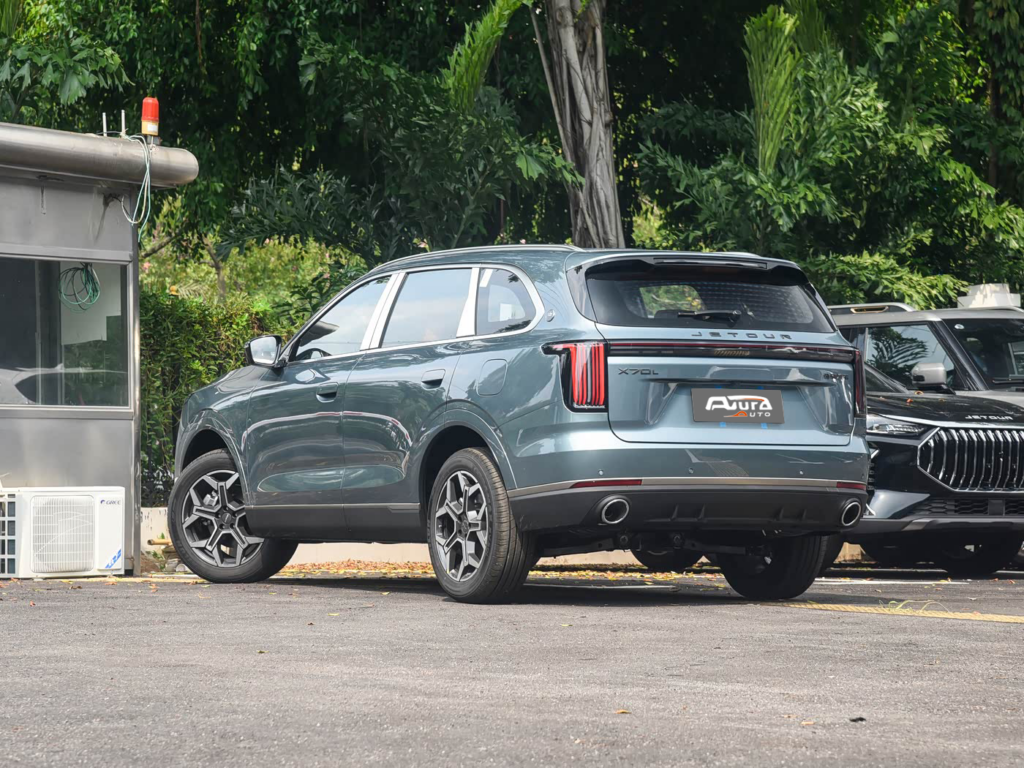 From the side, the Jetour X70L SUV features a long wheelbase and smooth profile, emphasizing interior space and stability. Large alloy wheels and a high ground clearance give the vehicle a commanding road presence, suitable for both urban environments and highway driving. At the rear, sleek LED taillights and a refined bumper design complete the modern SUV aesthetic.